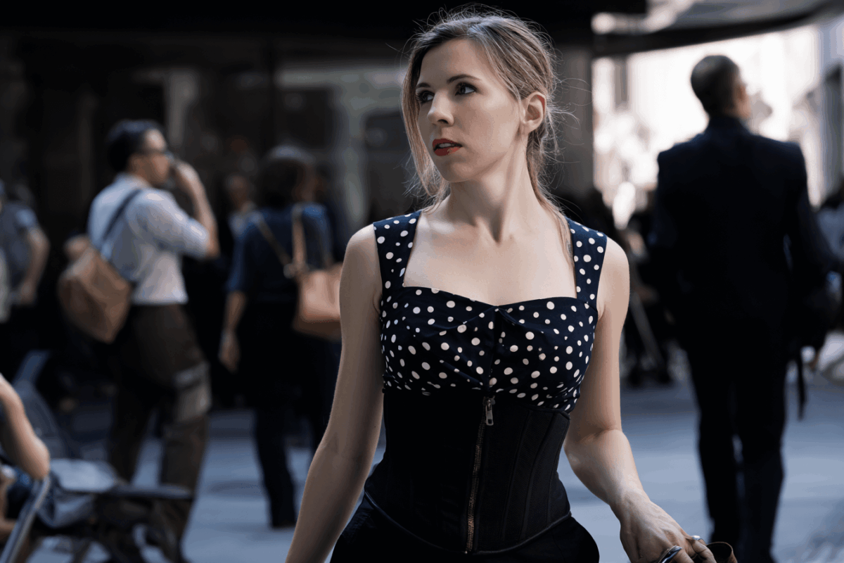 Wear a polka dot corset with high-waisted jeans or a mini skirt, paired with sneakers + a small shoulder bag. It’s super cute and perfect for cafe-hopping.